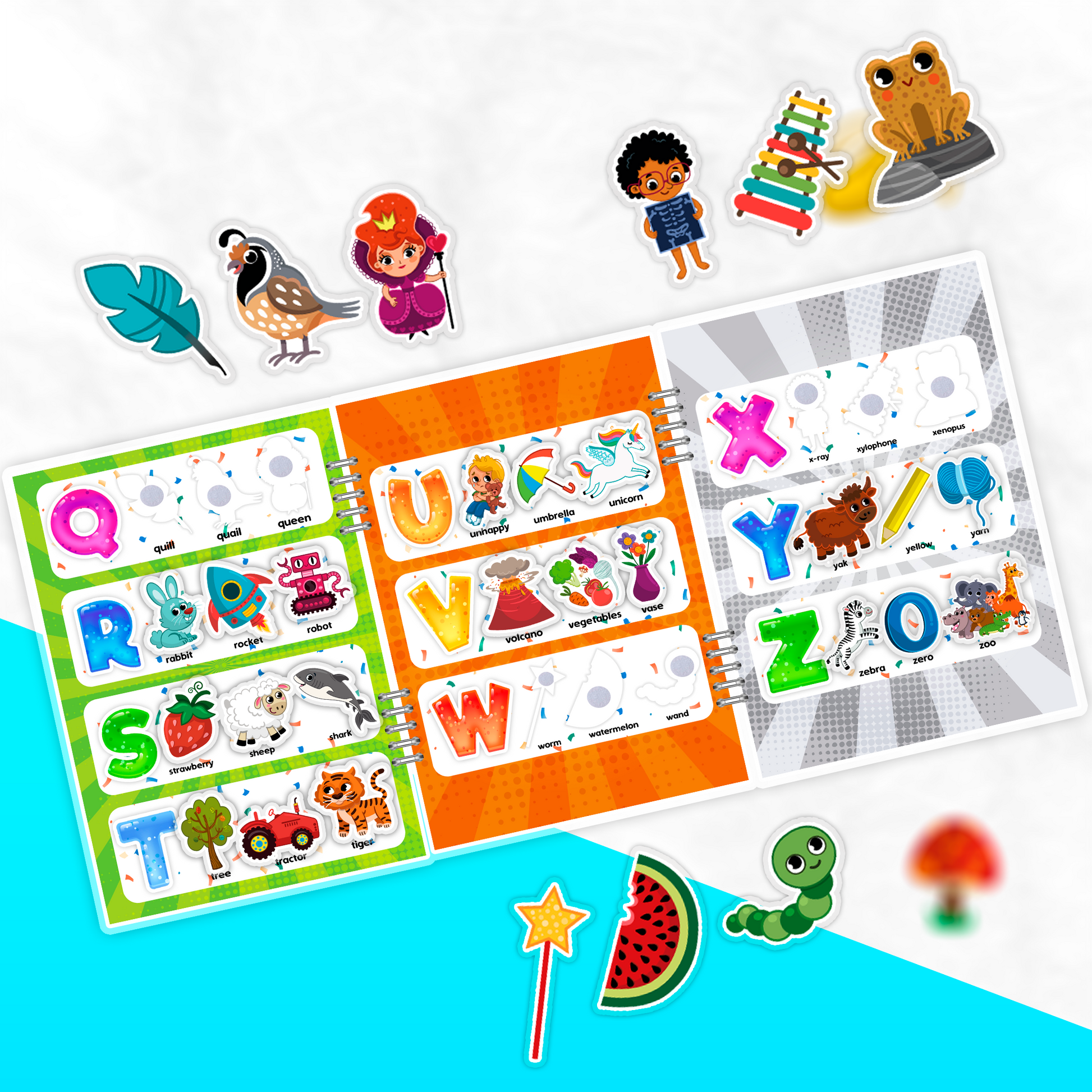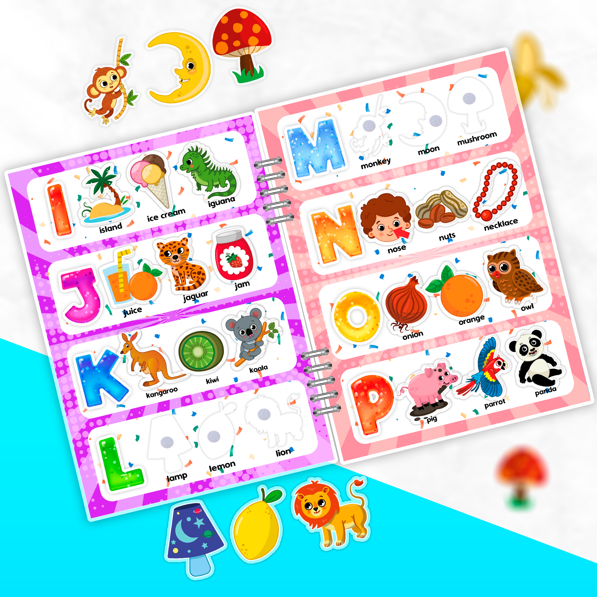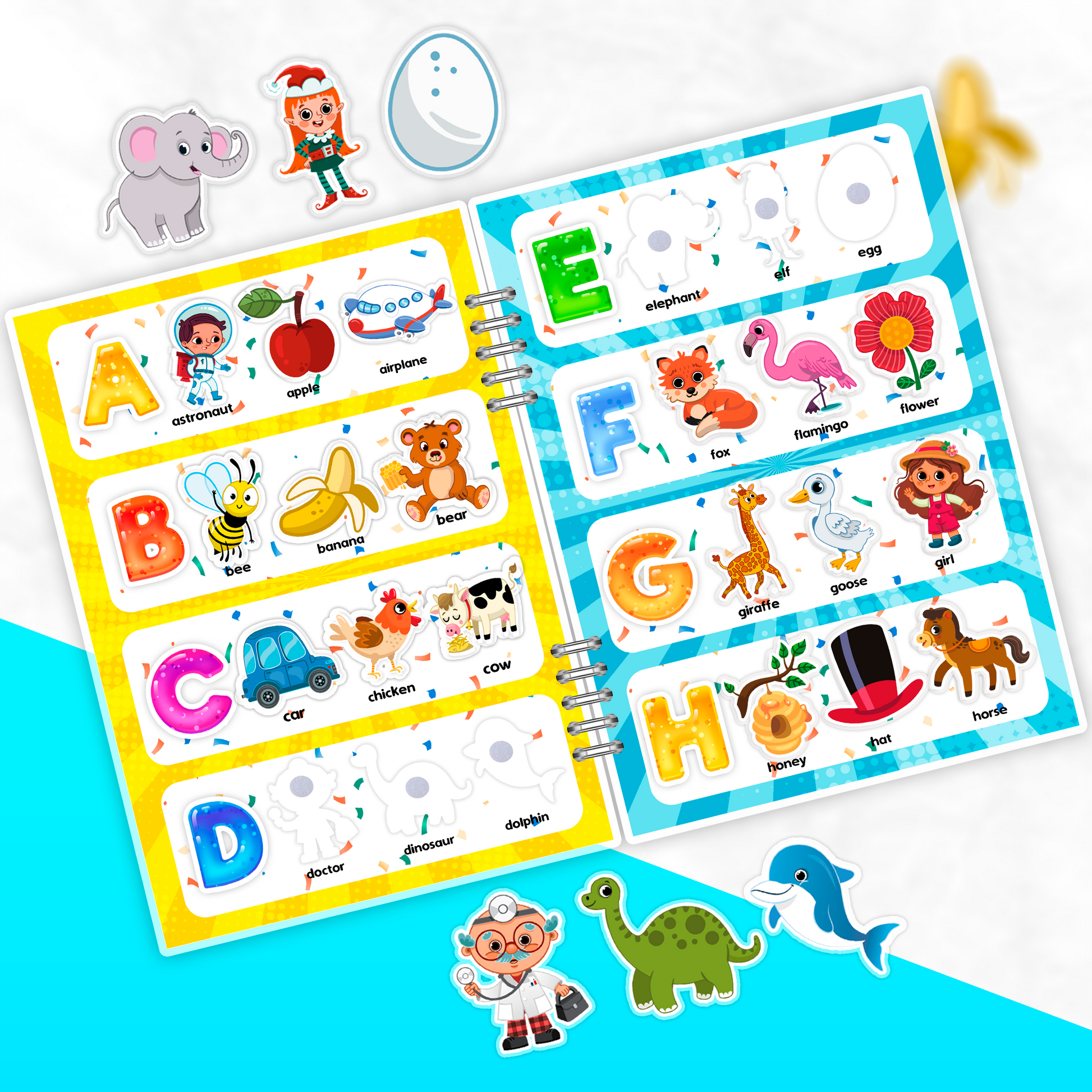 ¡Este libro es la manera más divertida de aprender el abecedario en inglés! Cada letra viene acompañada de 3 pegatinas para que los niños asocien cada letra con palabras y objetos. Una forma divertida de aprender y jugar al mismo tiempo.