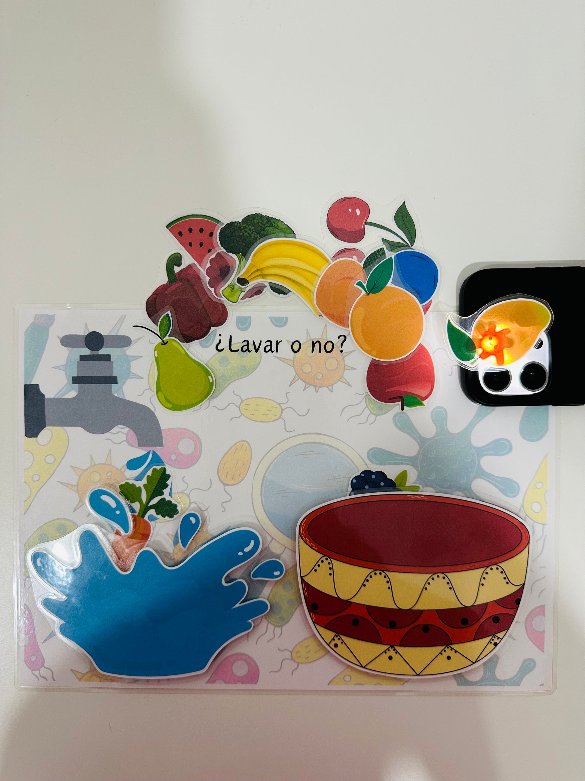 - Linterna mágica: Usa la linterna para "iluminar" las páginas y revelar microbios escondidos en las frutas y verduras.