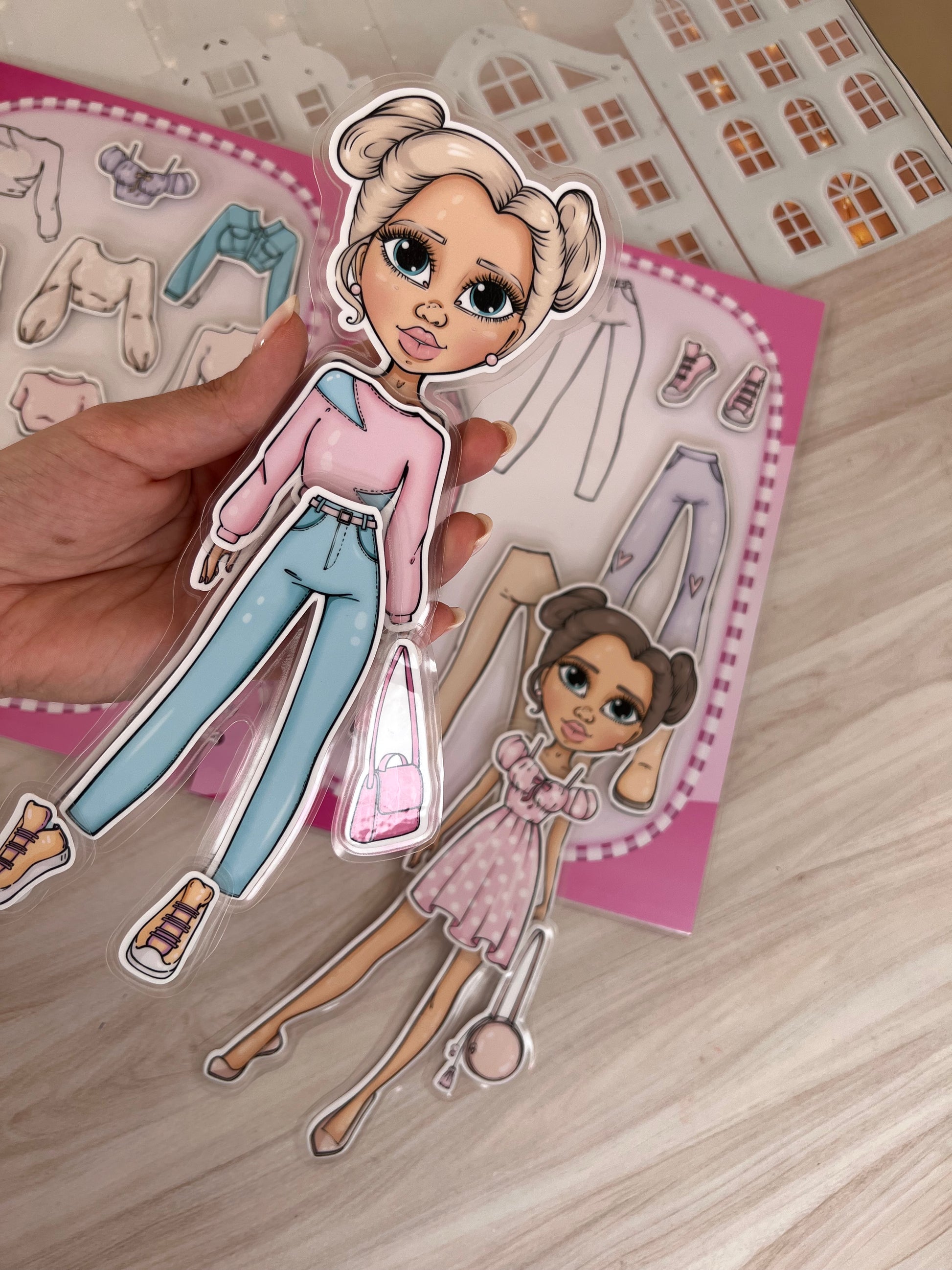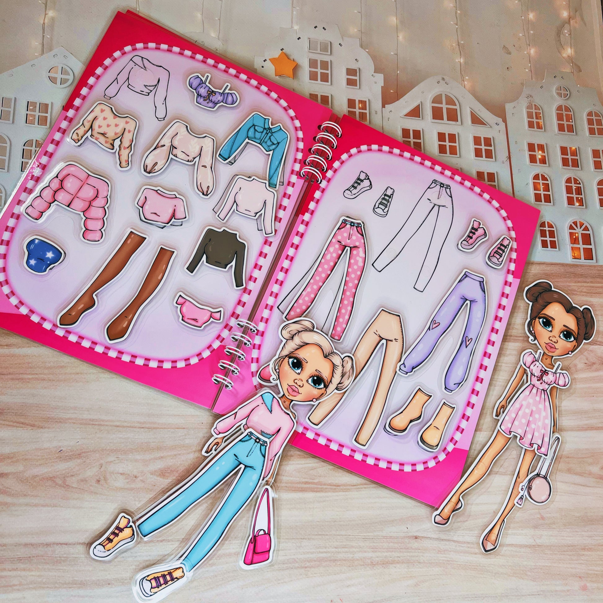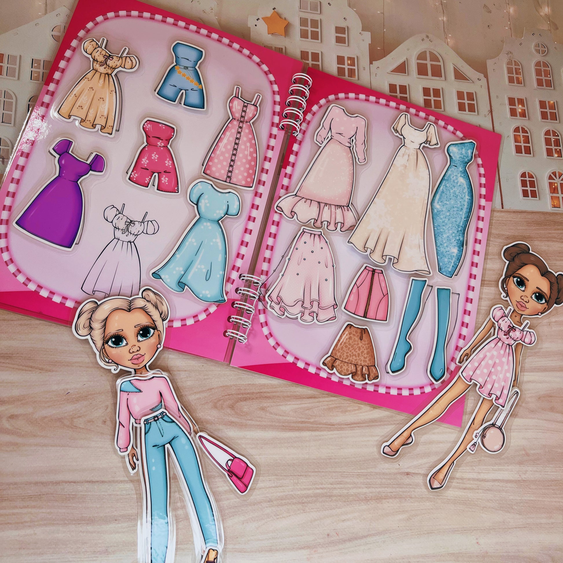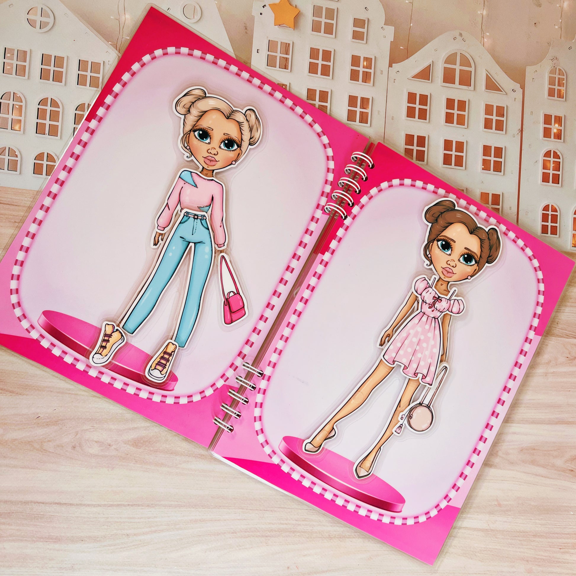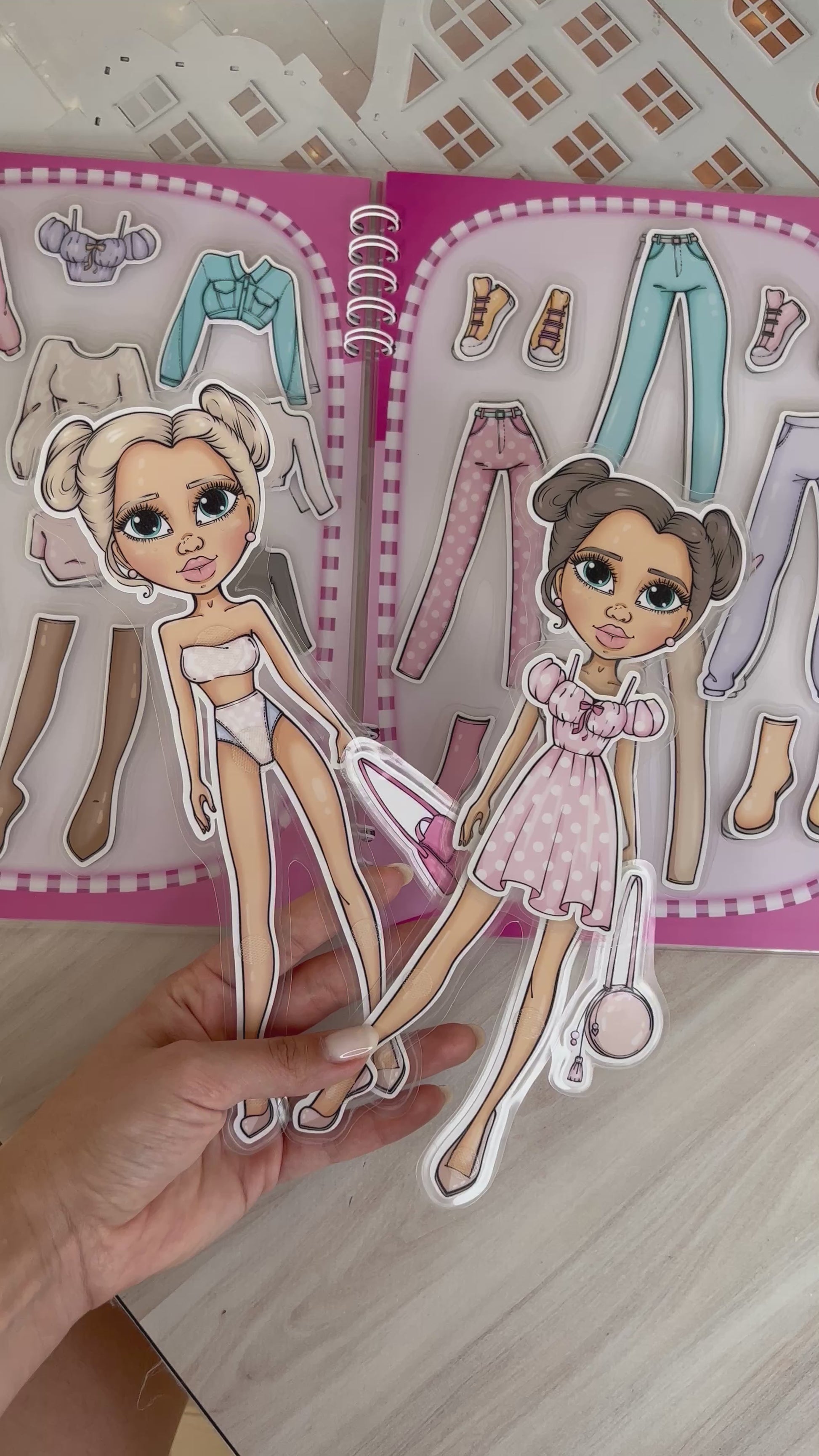 ¡Crea looks increíbles para tus muñecas! En este álbum, podrás vestir a dos muñecas con una variedad de ropa y accesorios. Diseña outfits, combina colores y estilos, ¡y haz que tus muñecas luzcan fantásticas en cada página!